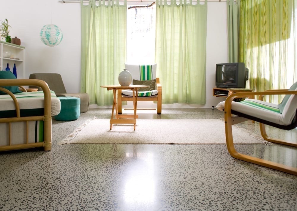 These were perhaps my most adventurous clients to date. The entire interior of the house is an exposed stone DiAMONDFLOOR finish, including bathrooms. After initial consultations the clients had the idea of seeding small quantities of coloured stone and glass in the concrete in specific locations around the house. Even the entry patio was an idea that arose from our consultation to press plant leaves as a decorative feature.